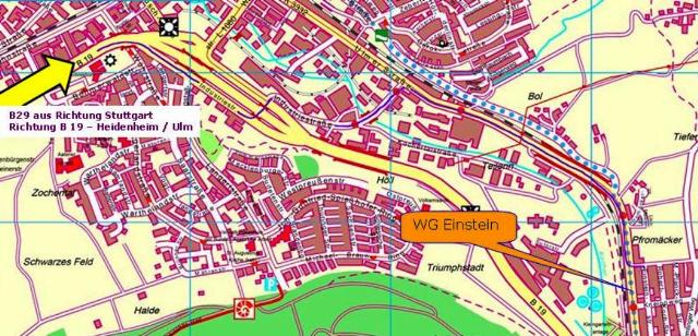 B 29 in Richtung Heidenheim / Ulm (B 19), Ausfahrt Aalen-West. Durch den Kreisel gerade durch, dann links unter der Brücke Richtung Wirtschaftszentrum. An der AVIA-Tankstelle / WIZ rechts Richtung Ulm.