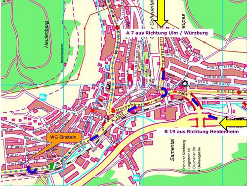 Aalen / Oberkochen, Richtung Aalen. Wenn es nicht mehr weiter geht: links Richtung Aalen-Ebnat (Vorsicht: permanenter Blitzer). Ortseingang Unterkochen: Am Ende der Gefällestrecke an der Ampel rechts Richtung Ortsmitte / Aalen. Am Ortsausgang von Unterkochen kurz vor der OMV-Tankstelle bzw. der Bushaltestelle rechts, |